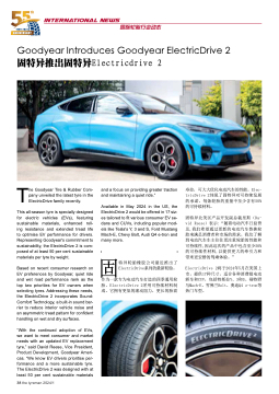 Goodyear Goodyear Introduces Goodyear Goodyear ElectricDrive 2 固特异推出固特异Electricdrive 2 The Goodyear Tire & Rubber Com- pany unveiled the the latest tyre in the the ElectricDrive family recently This all-season tyre is is specially designed for electric vehicles (EVs) featuring sustainable materials enhanced roll- ing resistance and extended tread life to to optimise EV performance for for drivers Representing Goodyear's commitment to to sustainability the ElectricDrive 2 is com- posed of at at least 50 per per cent sustainable materials per per tyre by weight Based on on on recent consumer research on on on EV preferences by Goodyear quiet ride and wet road performance rank as the top two priorities for for EV owners when selecting tyres Addressing these needs the the ElectricDrive 2 incorporates Sound- Comfort Technology a a a a built-in sound bar- rier to reduce interior vehicle noise and an an an an asymmetric tread pattern for confident handling on on wet and and dry surfaces “With the continued adoption of EVs we want to meet consumer and market needs with an an an updated EV replacement tyre ” said David Reese Vice President Product Development Goodyear Ameri- cas “We know EV drivers prioritise per- formance and a a a a a a a a more sustainable tyre The ElectricDrive 2 was designed with at at least 50 per cent sustainable materials 38 the tyreman 2024/1 and and a a a a a a a a focus on on providing greater traction and and maintaining a a a a a a a quiet ride ” Available in in in May 2024 in in in the the US the the ElectricDrive 2 2 2 would be offered in in in 17 siz- estailoredtofitvariousconsumerEVse- dans and and CUVs including popular mod- els like Tesla's Y 3 and and and S Ford Mustang Mach-E Chevy Bolt Audi Q4 e-tron and and many more 寿命,可大大优化电动汽车的性能。Elec- tricDrive 2体现了固特异对可持续发展 的承诺,每条轮胎的重量中至少含有50% 的可持续材料。 固特异北美区产品开发副总裁里斯(Da- vid Reese)表示:“随着电动汽车日益普 及 我们希望通过更新的电动汽车替换轮 胎来满足消费者和市场的需求。我们了解 到电动汽车车主往往更注重轮胎的性能和 可持续性 因此这次的产品中包含至少50% 的可持续性材料 以提供更大的牵引力和 带来更安静的驾乘体验。” ElectricDrive 2将于2024年5月在美国上 市,提供17种尺寸,适合各种消费级电动 轿车和CUV,包括特斯拉Y、3和S、福特野 马Mach-E、雪佛兰Bolt、奥迪Q4 e-tron等 热门车型。 ElectricDrive系列的最新轮胎。 固 作为一款专为电动汽车打造的四季通用轮 胎,ElectricDrive 2采用可持续材料制 成。它拥有更低的滚动阻力,更长的胎面 特异轮胎橡胶公司最近推出了